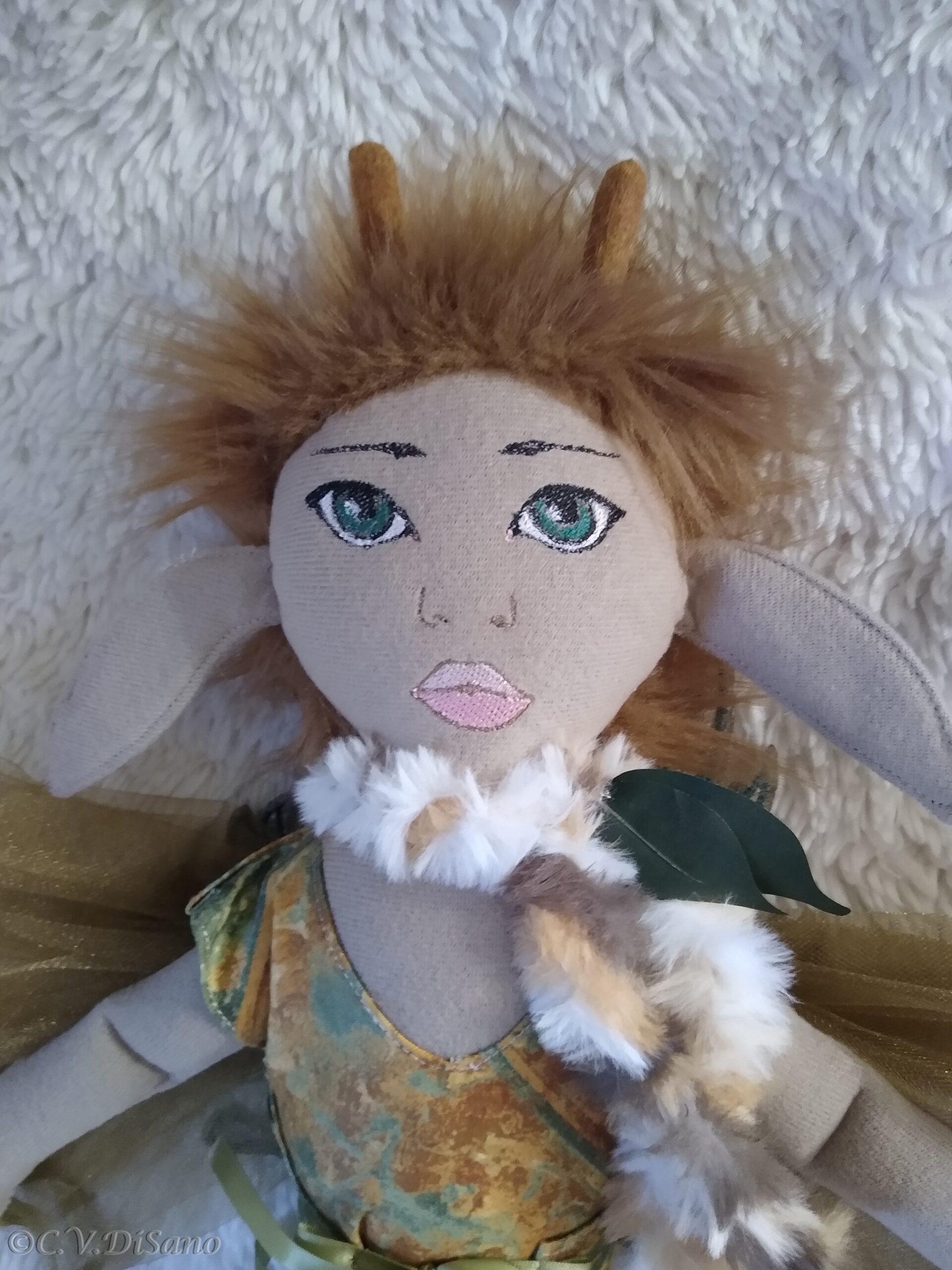 This is a handmade one of a kind little people friends, doe, a deer, faerie, fae, fairy plush soft doll, made with various remnant fabrics, there will be no one “a-like” this original doll. She is large, approximately 20 to 22 inches, with an embroidered butterfly that landed on her hand. Her body is created with fleece fabric, her face embroidered with my original digitized design. Her hair is felt, hand sewn, typically with cascading velvet yarn flowing from the top. This Doe, has faux fur for her hair. Clothes from remnant fabrics are typically sewn onto the doll. Her wings are embroidered with my own design onto various materials I have available, holographic, tulle, yarn or ribbon and silk flowers, and come off by way of velcro. Her feet are hooves. She was machine and hand sewn. If any of my dolls have beads, sequins, buttons, or small parts of any kind, just a warning they can possibly be harmful to young children. Damp cloth wash ONLY. Please look closely at pictures or message me with questions. She is a friend of The Little People…An Enchanting Adventure book series.