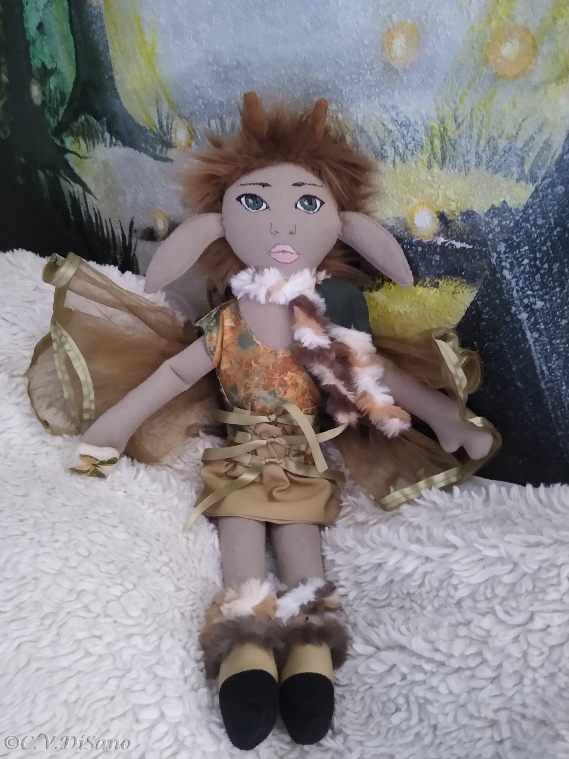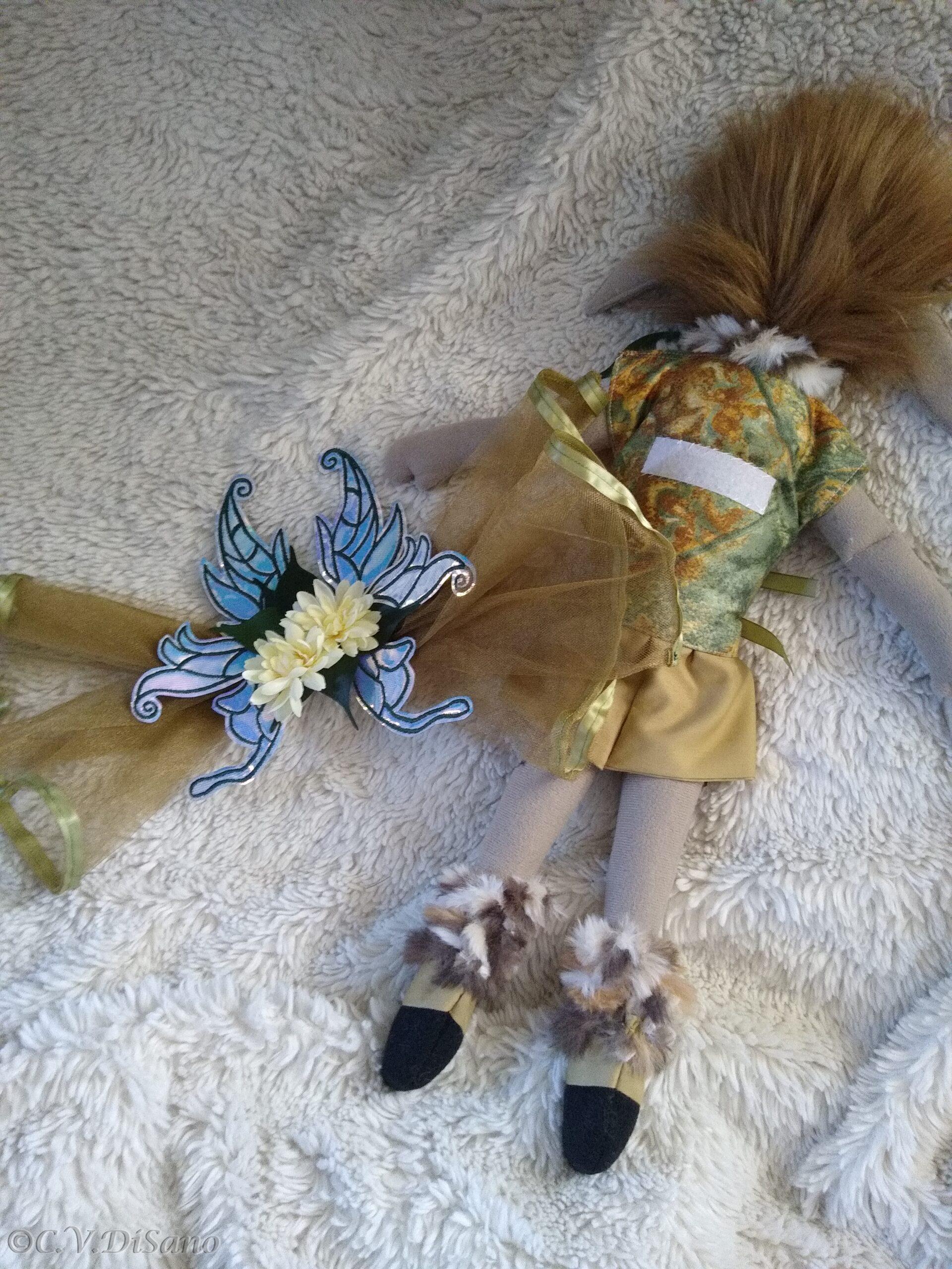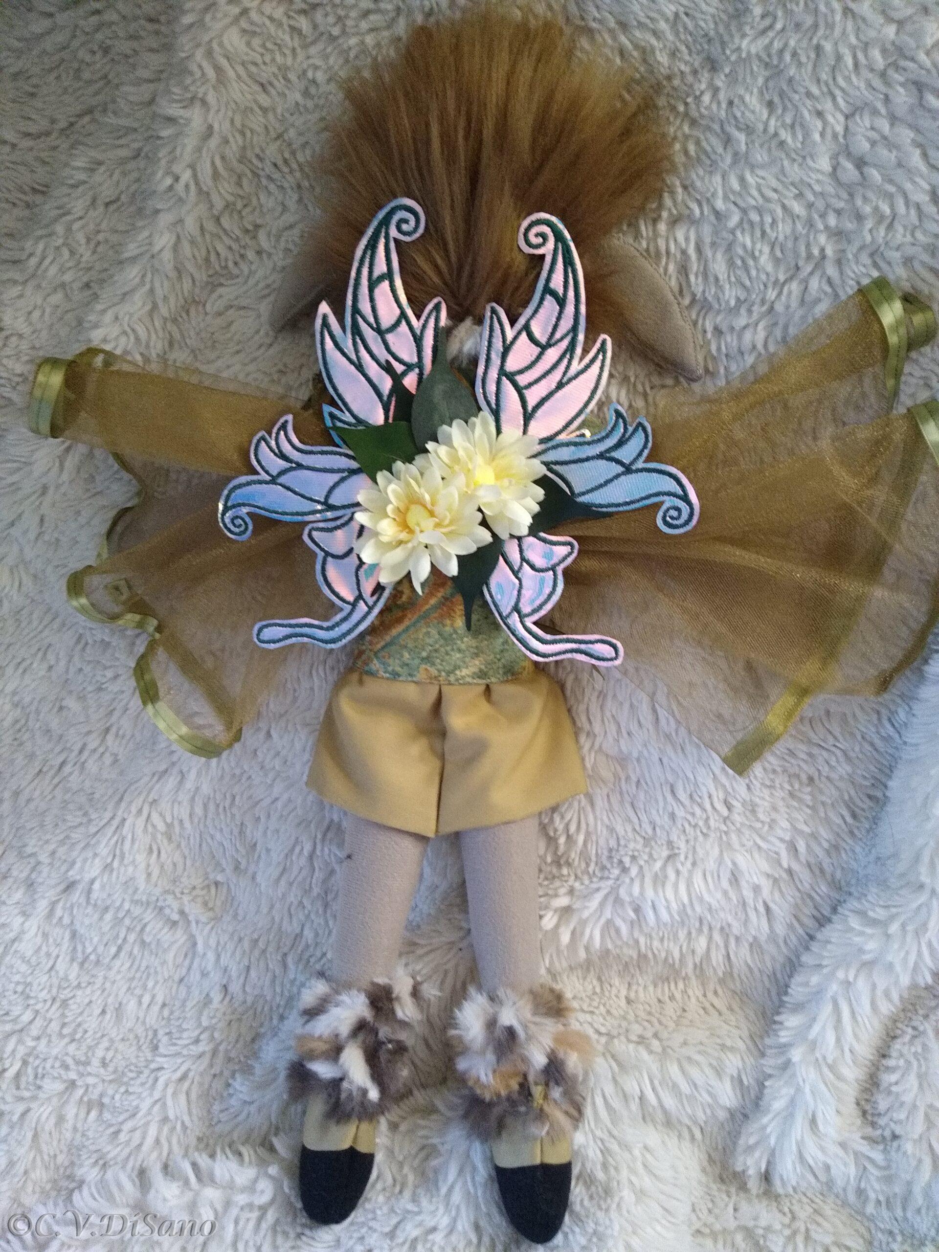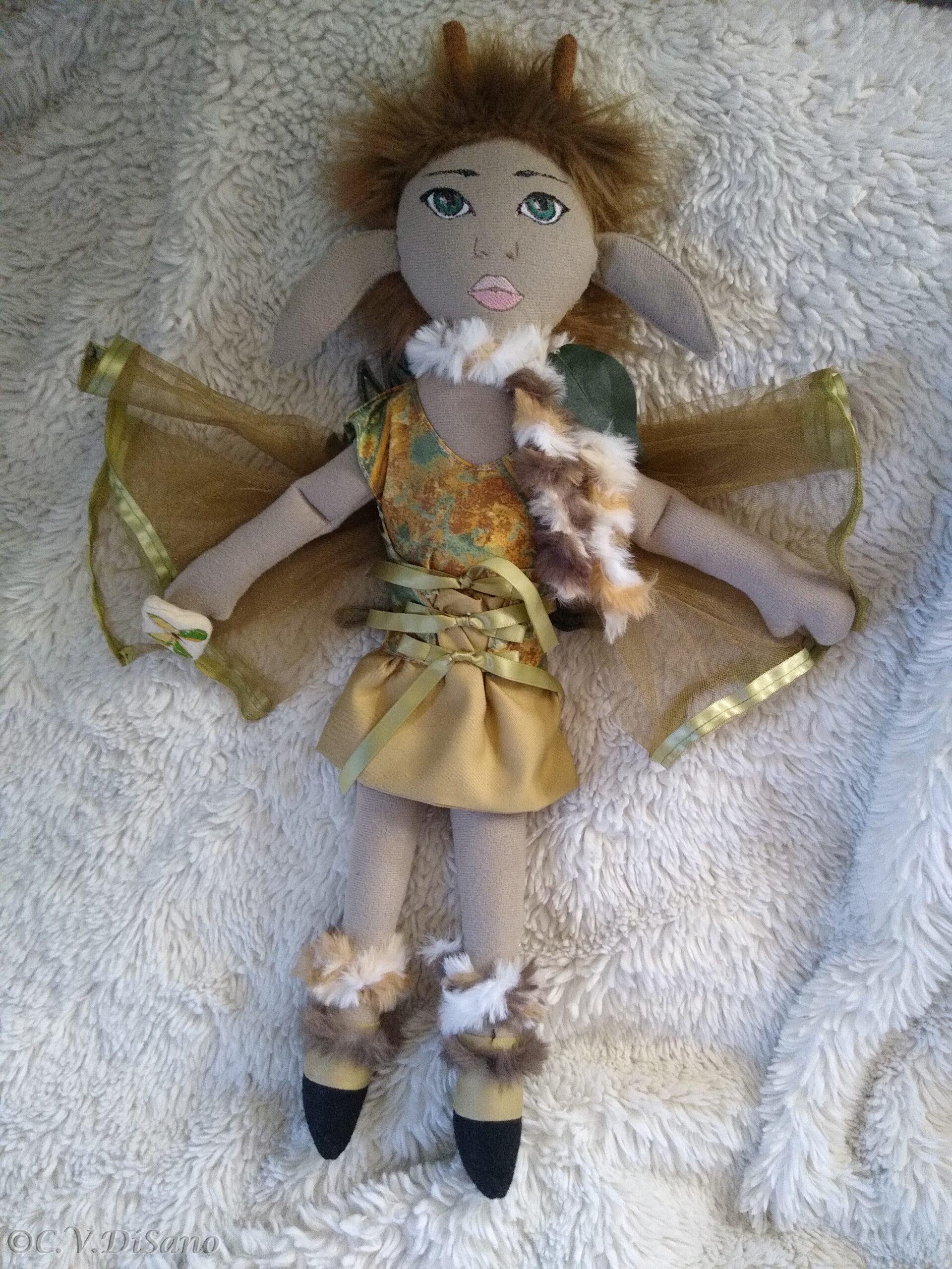 This is a handmade one of a kind little people friends, doe, a deer, faerie, fae, fairy plush soft doll, made with various remnant fabrics, there will be no one “a-like” this original doll. She is large, approximately 20 to 22 inches, with an embroidered butterfly that landed on her hand. Her body is created with fleece fabric, her face embroidered with my original digitized design. Her hair is felt, hand sewn, typically with cascading velvet yarn flowing from the top. This Doe, has faux fur for her hair. Clothes from remnant fabrics are typically sewn onto the doll. Her wings are embroidered with my own design onto various materials I have available, holographic, tulle, yarn or ribbon and silk flowers, and come off by way of velcro. Her feet are hooves. She was machine and hand sewn. If any of my dolls have beads, sequins, buttons, or small parts of any kind, just a warning they can possibly be harmful to young children. Damp cloth wash ONLY. Please look closely at pictures or message me with questions. She is a friend of The Little People…An Enchanting Adventure book series.