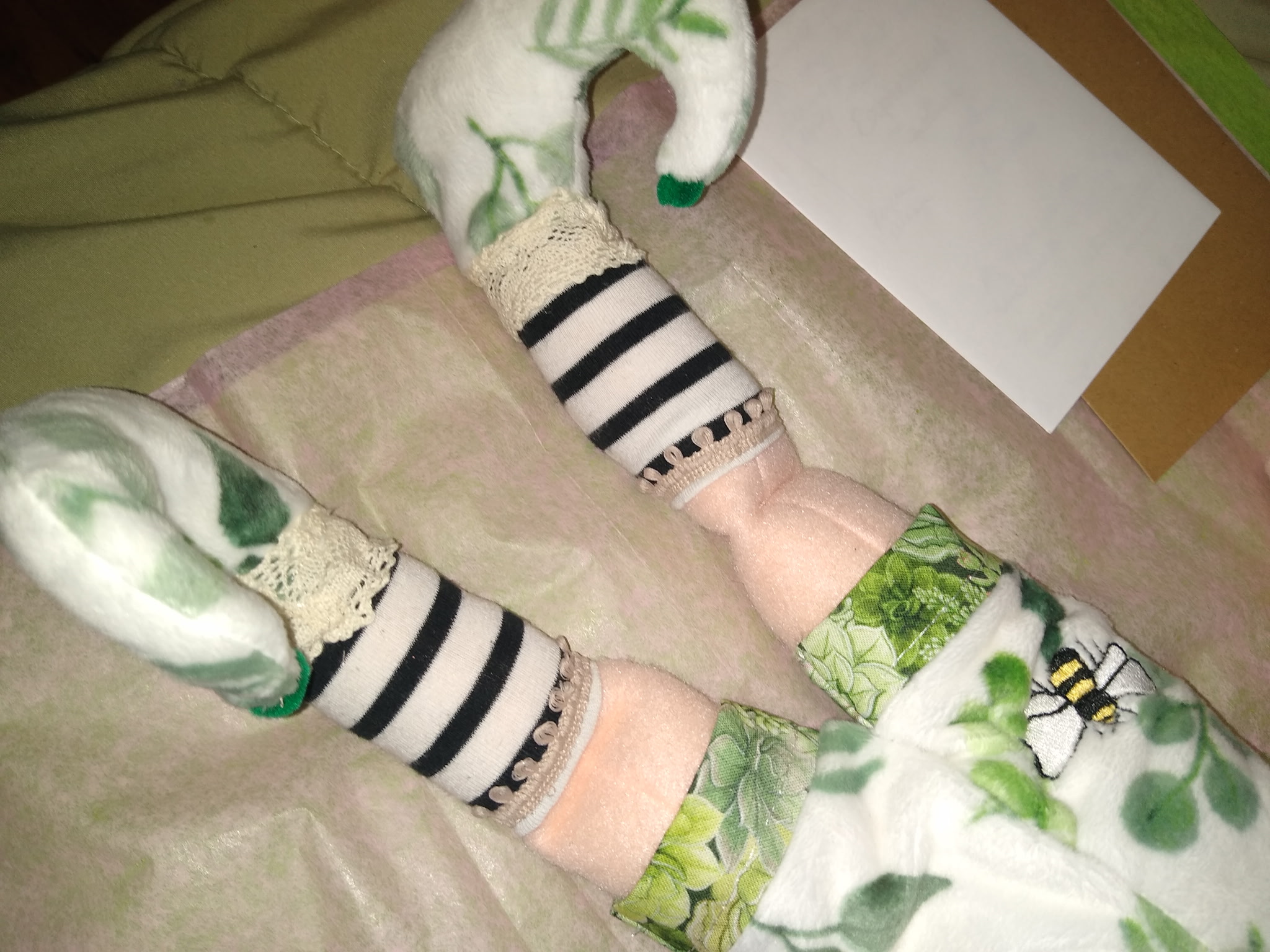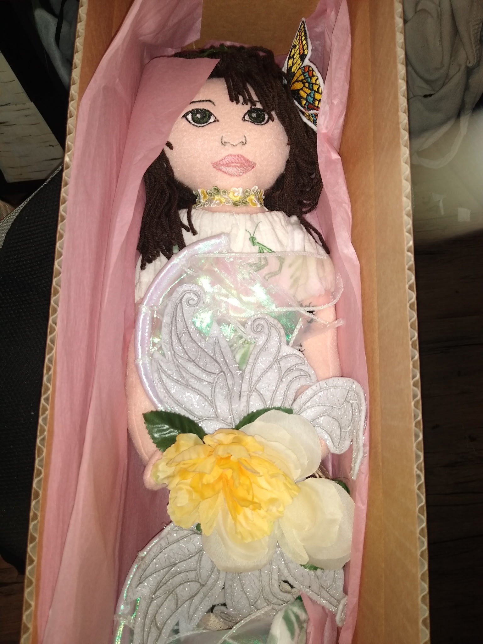 This Faerie doll has wired wings with flowing materials, (Unlike the tulle winged dolls,) as well as embroidered digitized butterfly wing design. My dolls are handmade one of a kind faerie, fae, fairy plush soft dolls, made with various remnant fabrics. There will be no one “a-like” this original doll. They are large, approximately 20 to 22 inches, with an embroidered butterfly that landed on their hand. The body is created with fleece fabric, faces embroidered with my original digitized design. Hair is sewn on with a wig of yarn with a felt scalp on most. Clothes are typically sewn onto the doll. The wings are embroidered with my own design onto holographic material, tulle, yarn or ribbon and silk flowers, and come off by way of velcro. My dolls are machine and hand sewn. If any of my dolls have beads, sequins, buttons, or small parts of any kind, just a warning they can possibly be harmful to young children. Damp cloth wash ONLY. Please look closely at pictures or message me with questions. She is a friend of The Little People…An Enchanting Adventure book series.