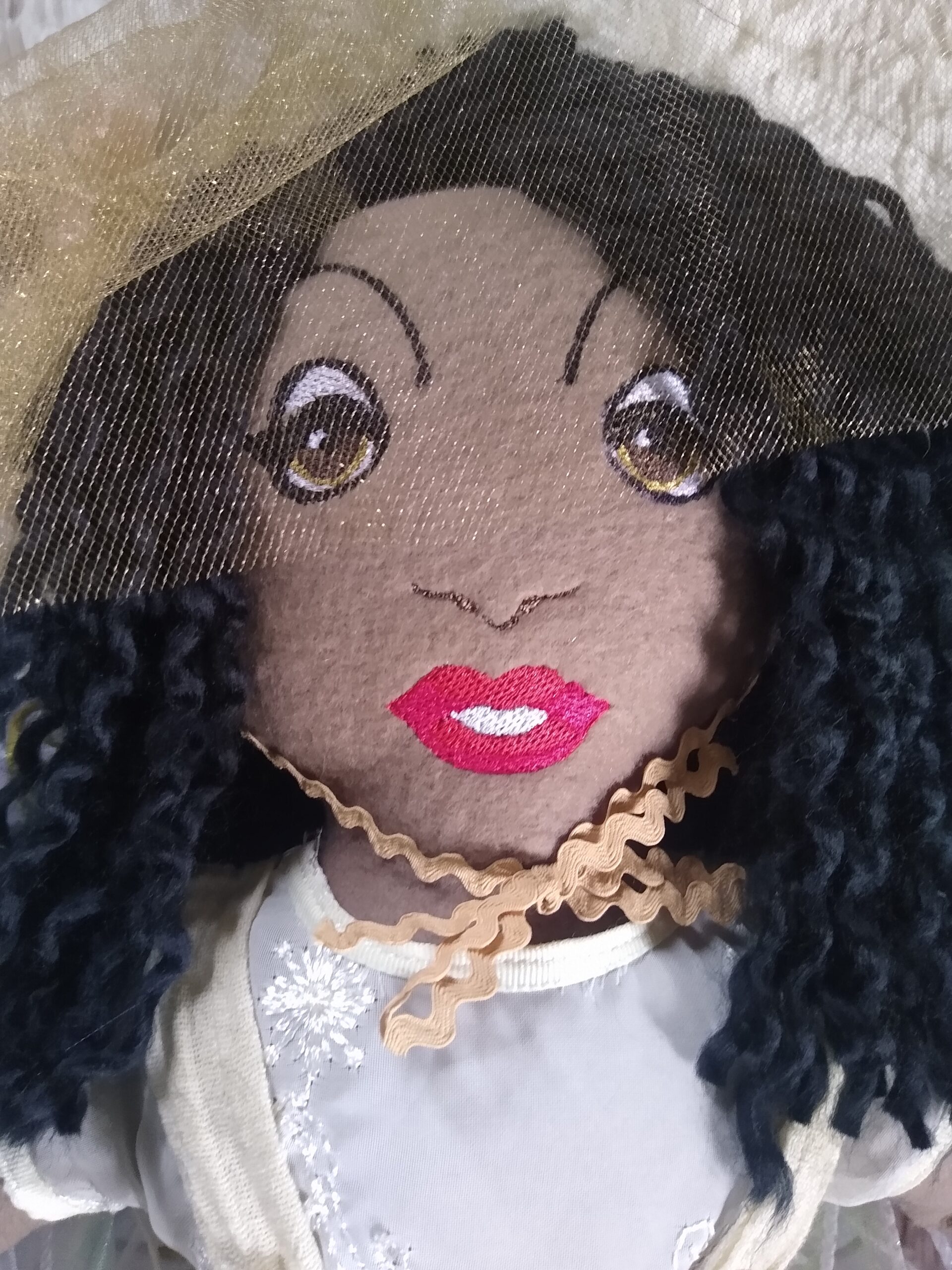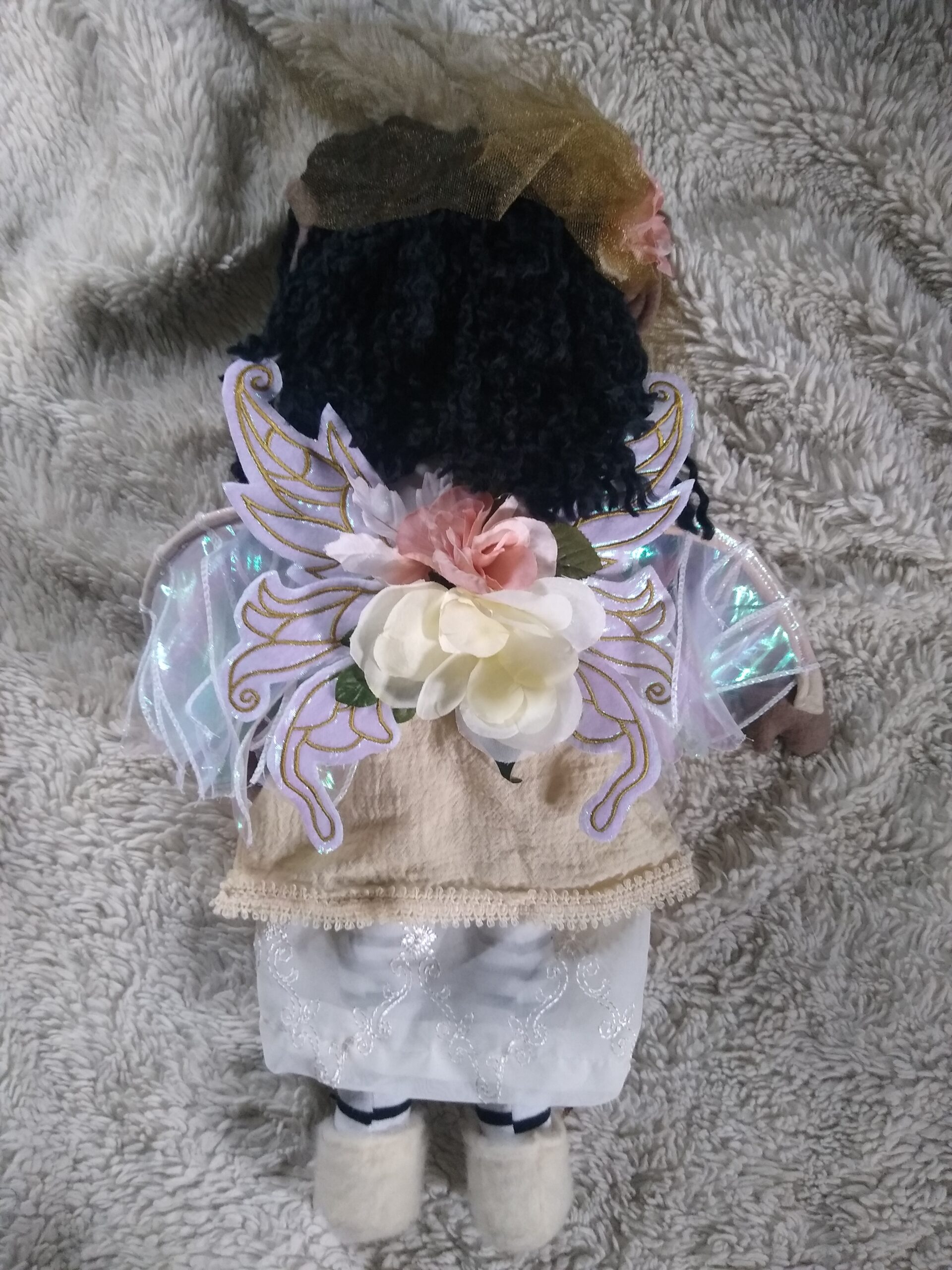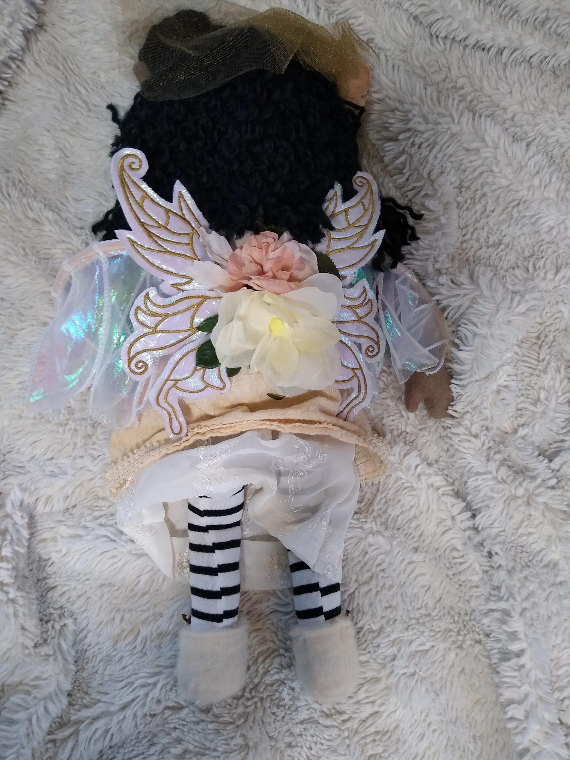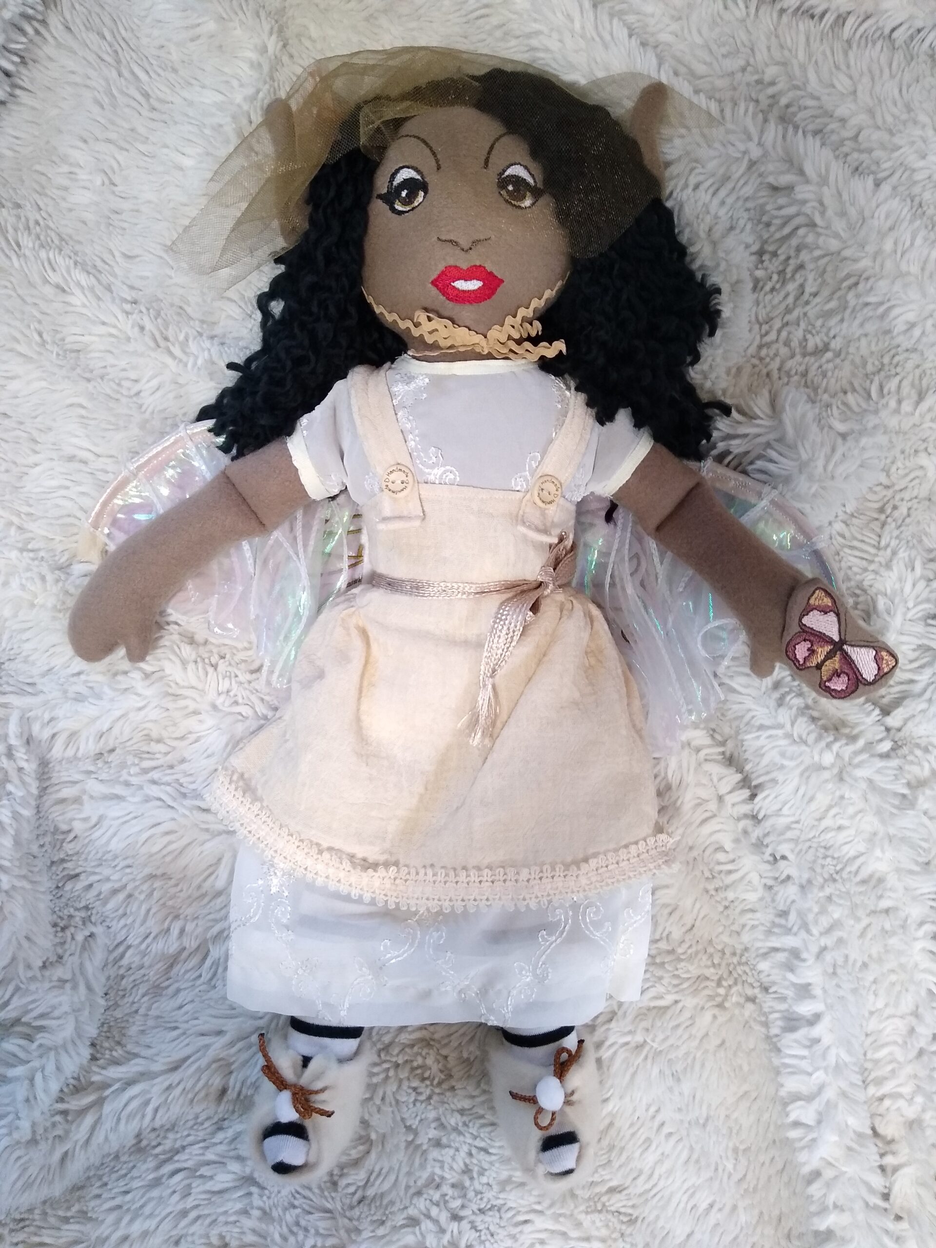 This Faerie doll has wired wings with flowing materials, (Unlike the tulle winged dolls,) as well as embroidered digitized butterfly wing design. My dolls are handmade one of a kind faerie, fae, fairy plush soft dolls, made with various remnant fabrics. There will be no one “a-like” this original doll. They are large, approximately 20 to 22 inches, with an embroidered butterfly that landed on their hand. The body is created with fleece fabric, faces embroidered with my original digitized design. Hair is sewn on with a wig of yarn with a felt scalp on most. Clothes are typically sewn onto the doll. The wings are embroidered with my own design onto holographic material, tulle, yarn or ribbon and silk flowers, and come off by way of velcro. My dolls are machine and hand sewn. If any of my dolls have beads, sequins, buttons, or small parts of any kind, just a warning they can possibly be harmful to young children. Damp cloth wash ONLY. Please look closely at pictures or message me with questions. She is a friend of The Little People…An Enchanting Adventure book series.
