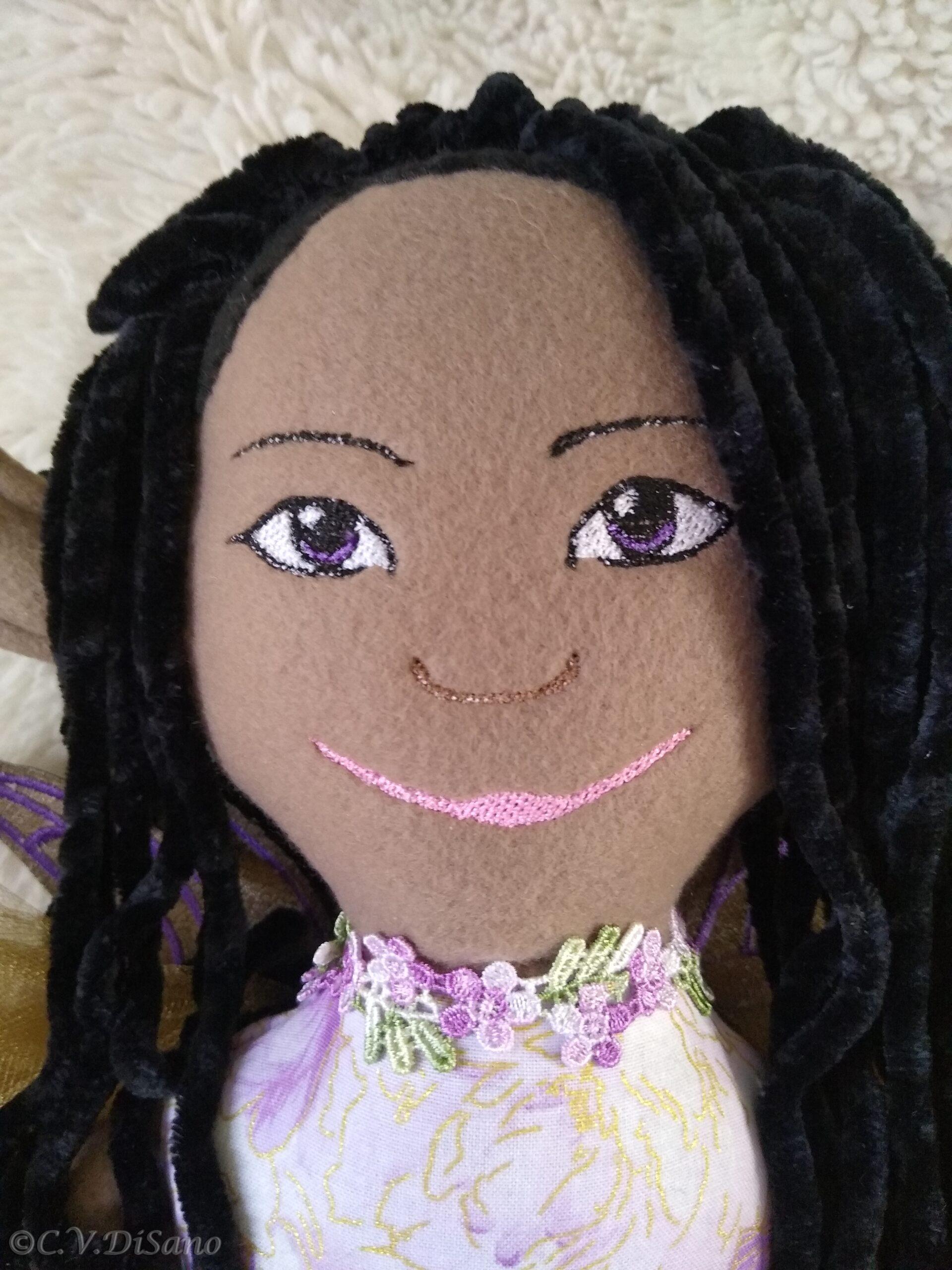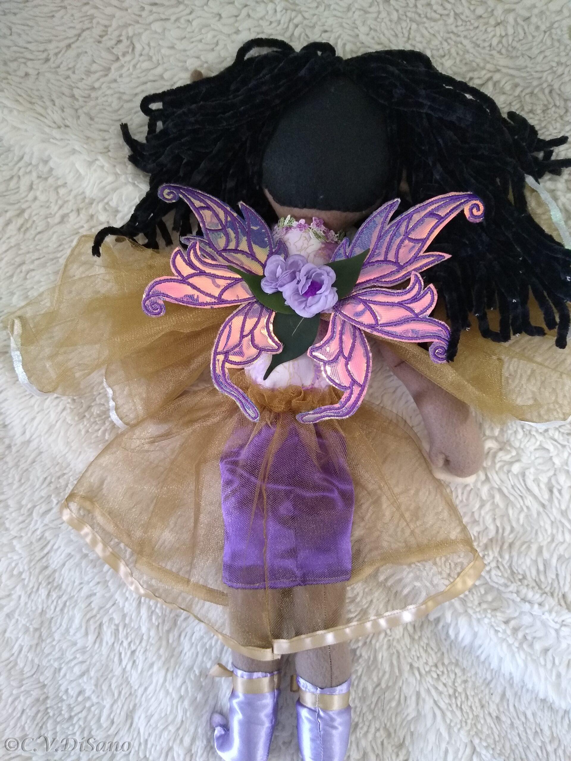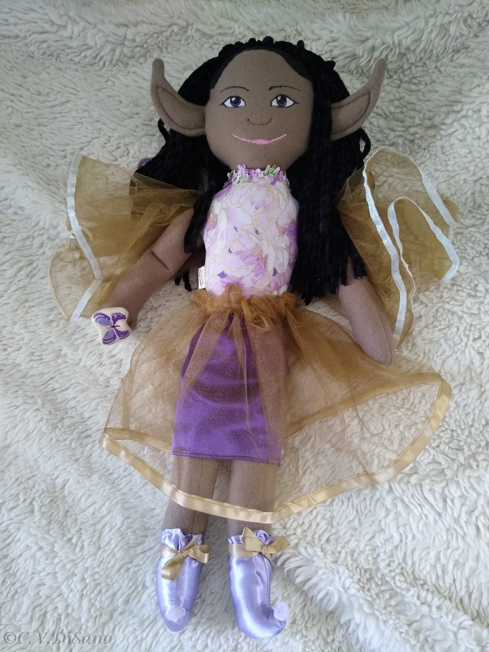 This is a handmade one of a kind little people friends, faerie, fae, fairy plush soft doll, made with various remnant fabrics, there will be no one “a-like” this original doll. She is large, approximately 20 to 22 inches, with an embroidered butterfly that landed on her hand. Her body is created with fleece fabric, her face embroidered with my original digitized design. Her hair is felt, hand sewn, with cascading yarn flowing from the top. Clothes from remnant fabrics are typically sewn onto the doll. Her wings are embroidered with my own design onto various materials I have available, holographic, tulle, yarn or ribbon and silk flowers, and come off by way of velcro. She was machine and hand sewn. If any of my dolls have beads, sequins, buttons, or small parts of any kind, just a warning they can possibly be harmful to young children. Damp cloth wash ONLY. Please look closely at pictures or message me with questions. She is a friend of The Little People…An Enchanting Adventure book series.
