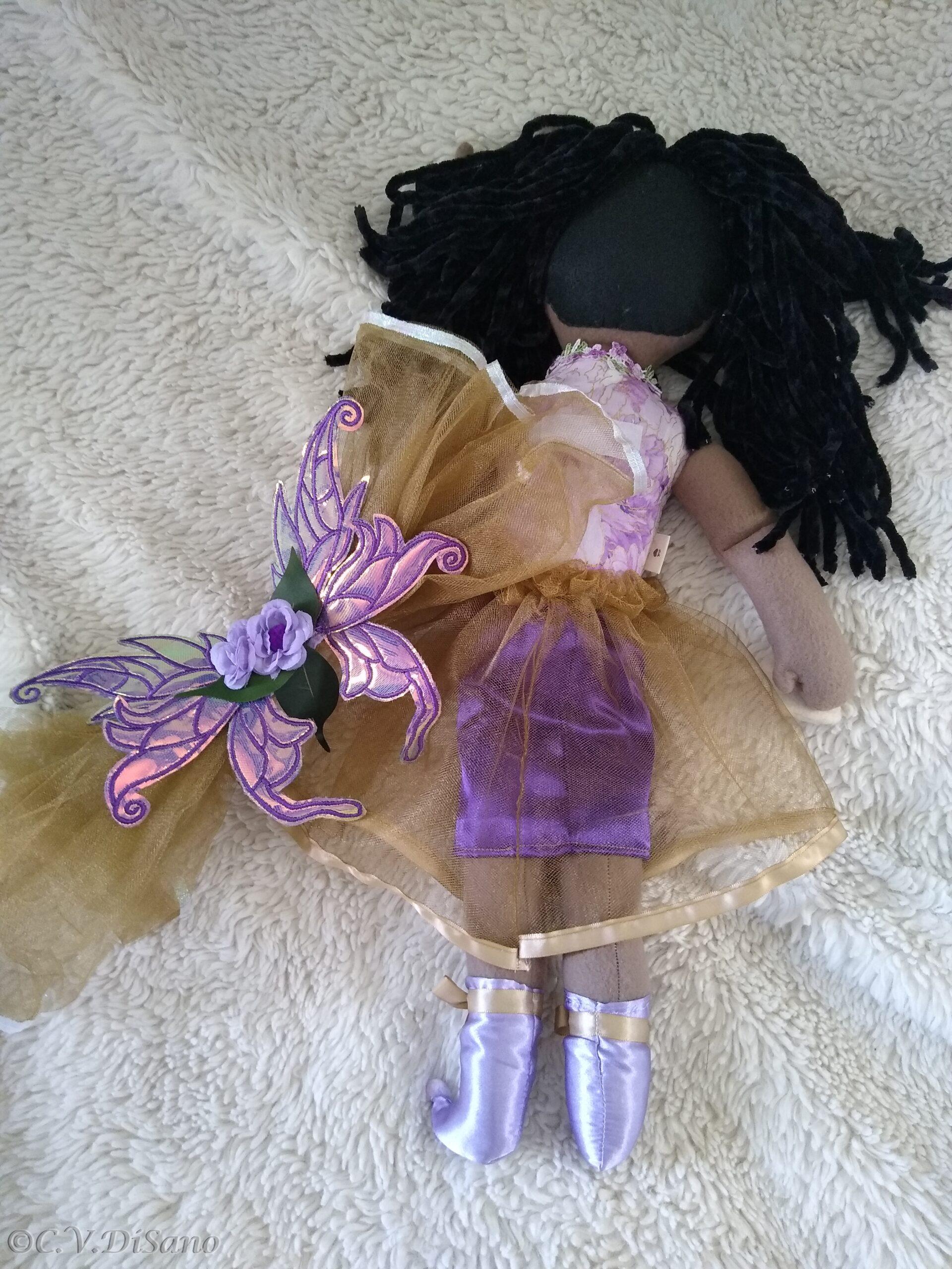 This is a handmade one of a kind little people friends, faerie, fae, fairy plush soft doll, made with various remnant fabrics, there will be no one “a-like” this original doll. She is large, approximately 20 to 22 inches, with an embroidered butterfly that landed on her hand. Her body is created with fleece fabric, her face embroidered with my original digitized design. Her hair is felt, hand sewn, with cascading yarn flowing from the top. Clothes from remnant fabrics are typically sewn onto the doll. Her wings are embroidered with my own design onto various materials I have available, holographic, tulle, yarn or ribbon and silk flowers, and come off by way of velcro. She was machine and hand sewn. If any of my dolls have beads, sequins, buttons, or small parts of any kind, just a warning they can possibly be harmful to young children. Damp cloth wash ONLY. Please look closely at pictures or message me with questions. She is a friend of The Little People…An Enchanting Adventure book series.