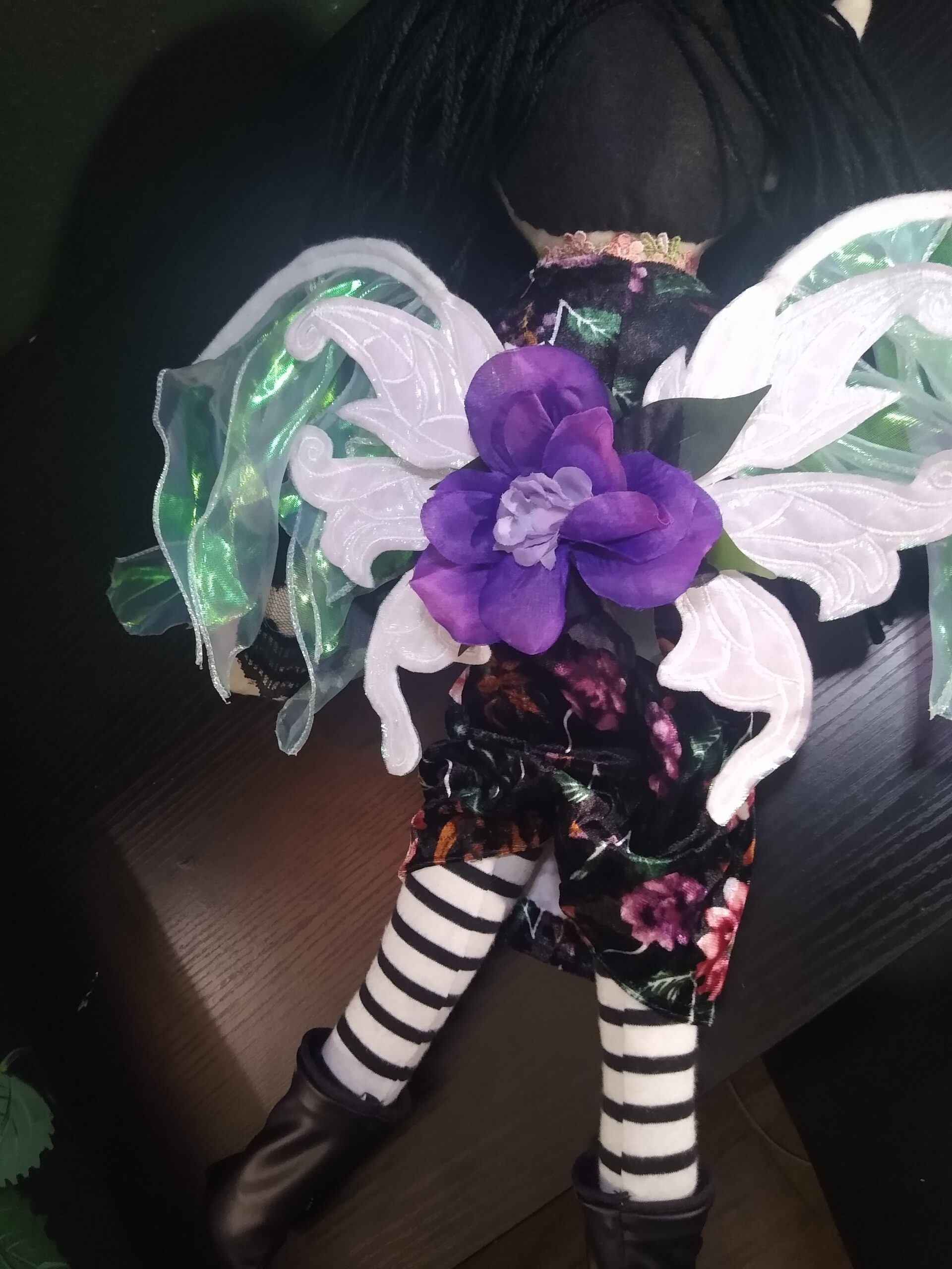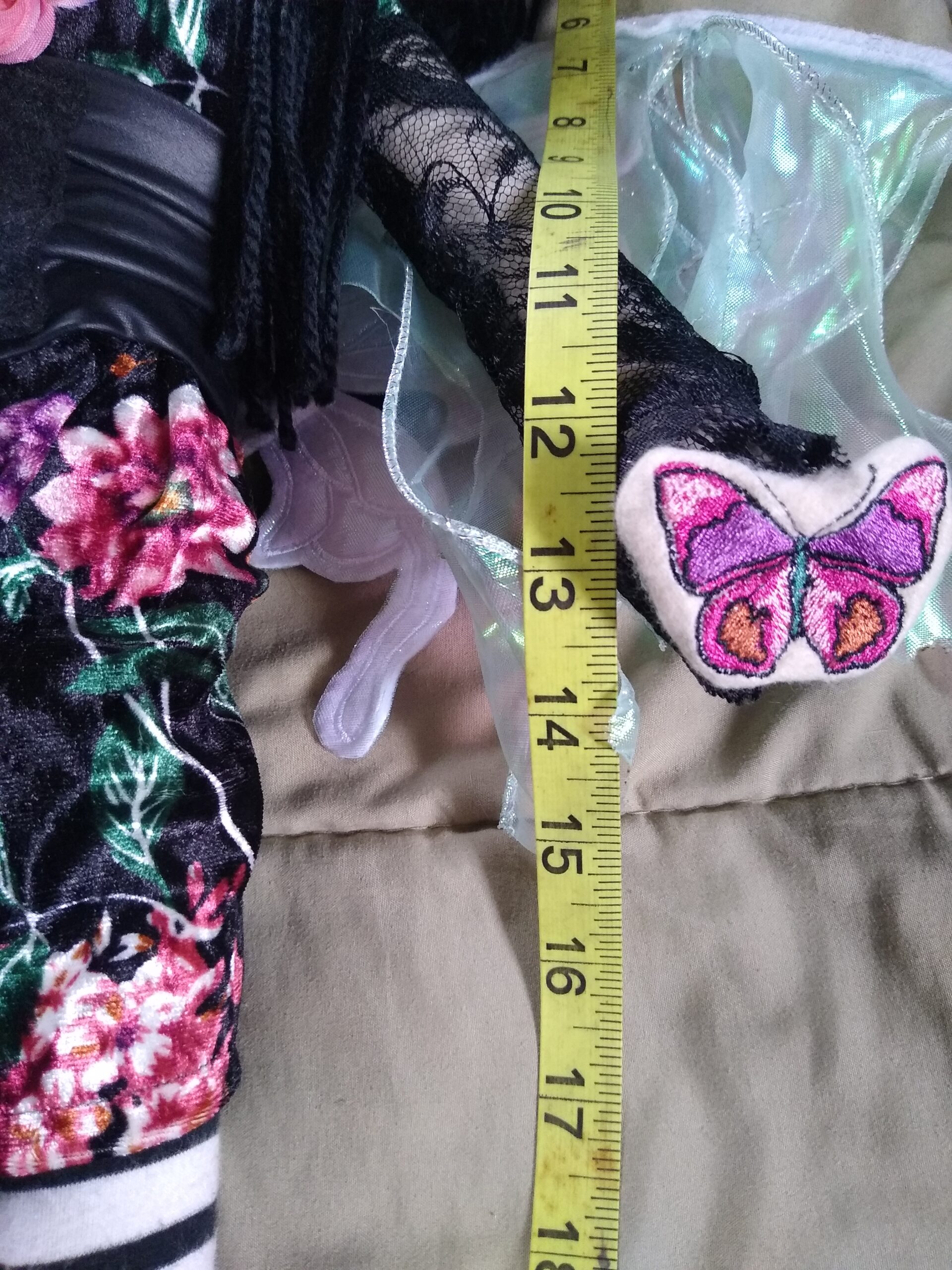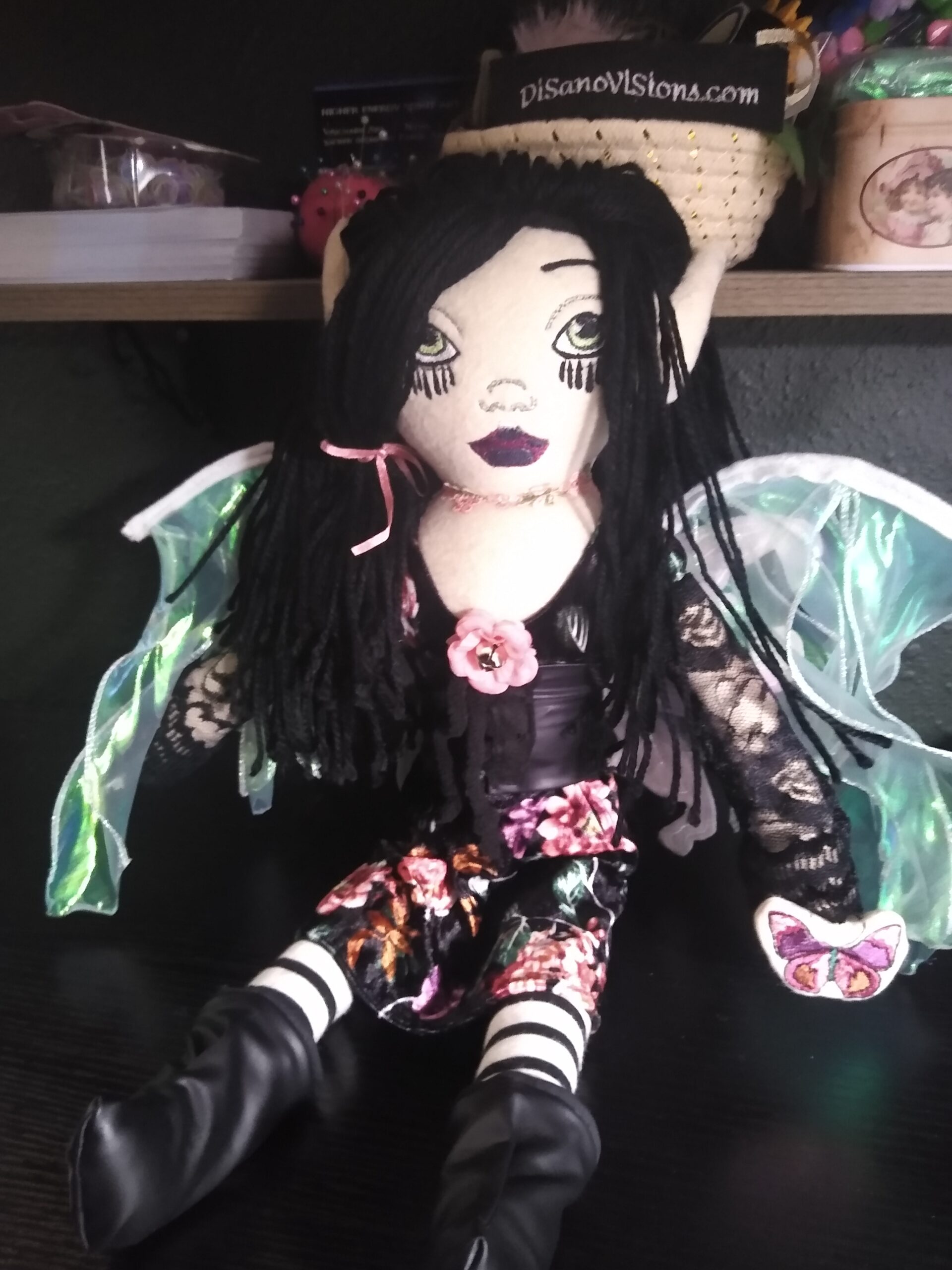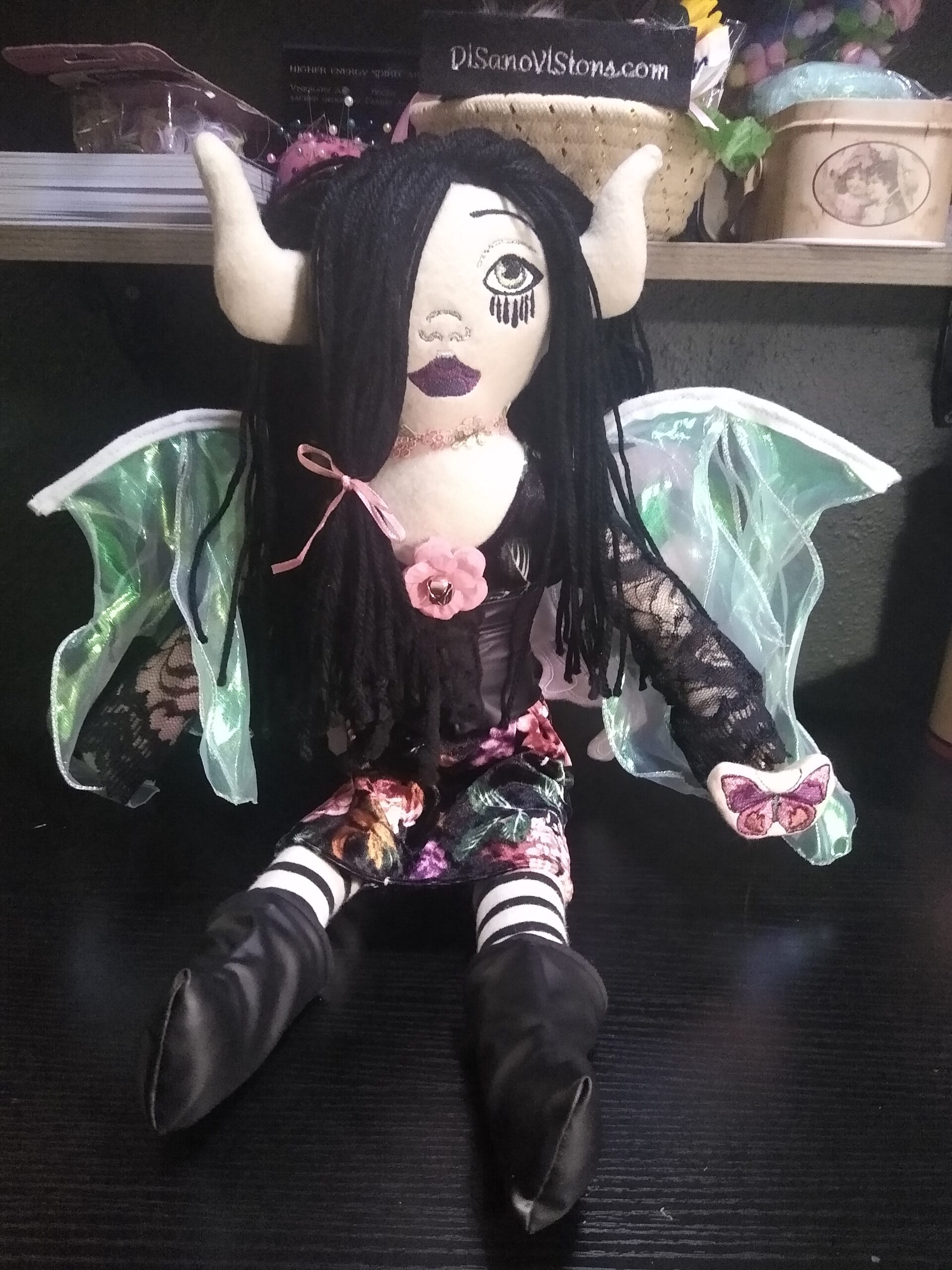 This Gothic Faerie doll has wired wings with flowing materials, (Unlike the tulle winged dolls,) as well as embroidered digitized butterfly wing design. My dolls are handmade one of a kind faerie, fae, fairy plush soft dolls, made with various remnant fabrics. There will be no one “a-like” this original doll. They are large, approximately 20 to 22 inches, with an embroidered butterfly that landed on their hand. The body is created with fleece fabric, faces embroidered with my original digitized design. Hair is sewn on with a wig of yarn with a felt scalp on most. Clothes are typically sewn onto the doll. The wings are embroidered with my own design onto holographic material, tulle, yarn or ribbon and silk flowers, and come off by way of velcro. My dolls are machine and hand sewn. If any of my dolls have beads, sequins, buttons, or small parts of any kind, just a warning they can possibly be harmful to young children. Damp cloth wash ONLY. Please look closely at pictures or message me with questions.