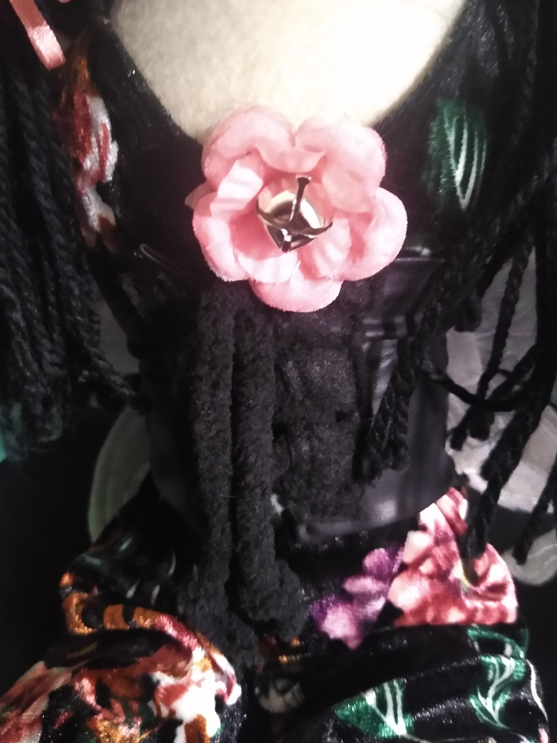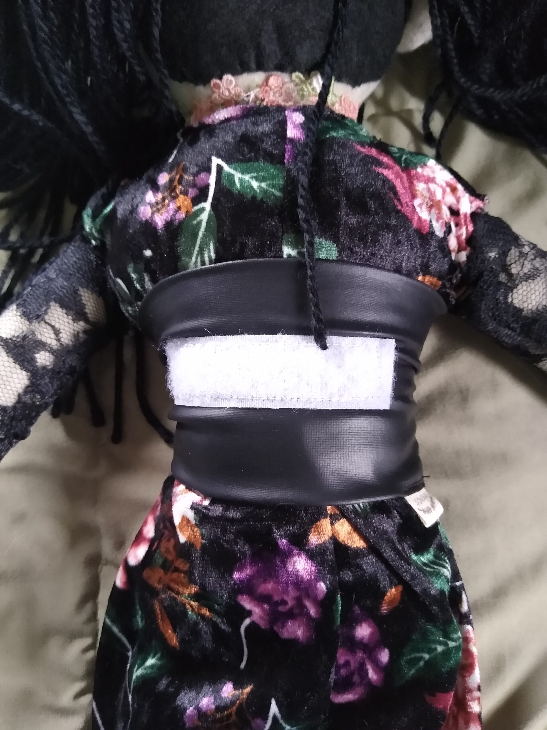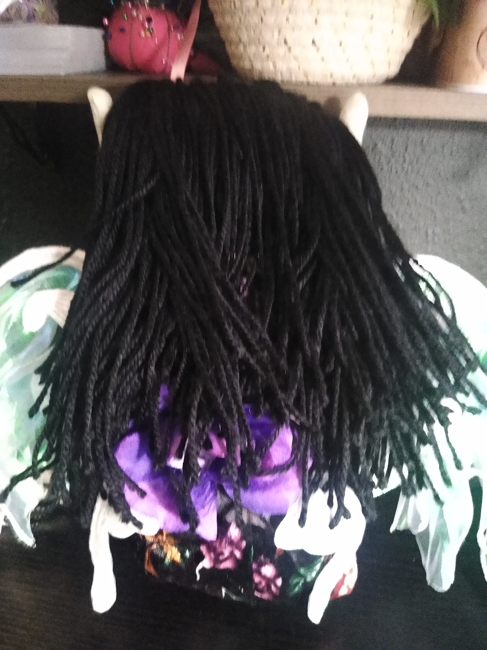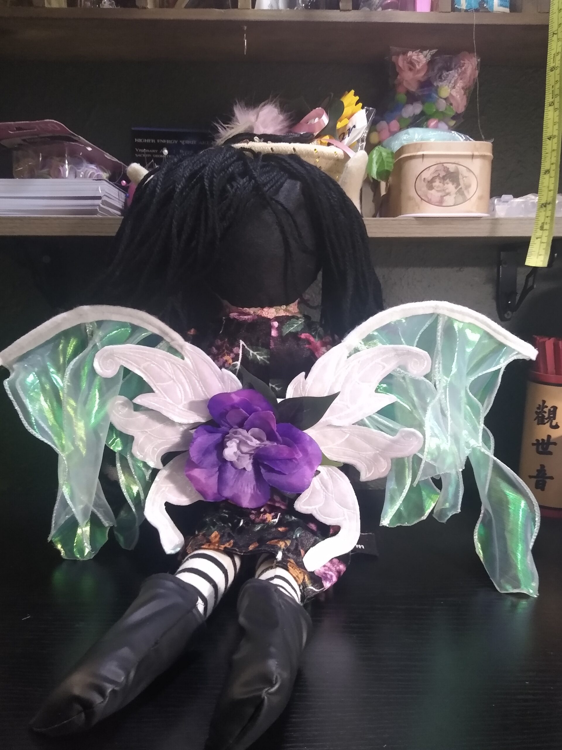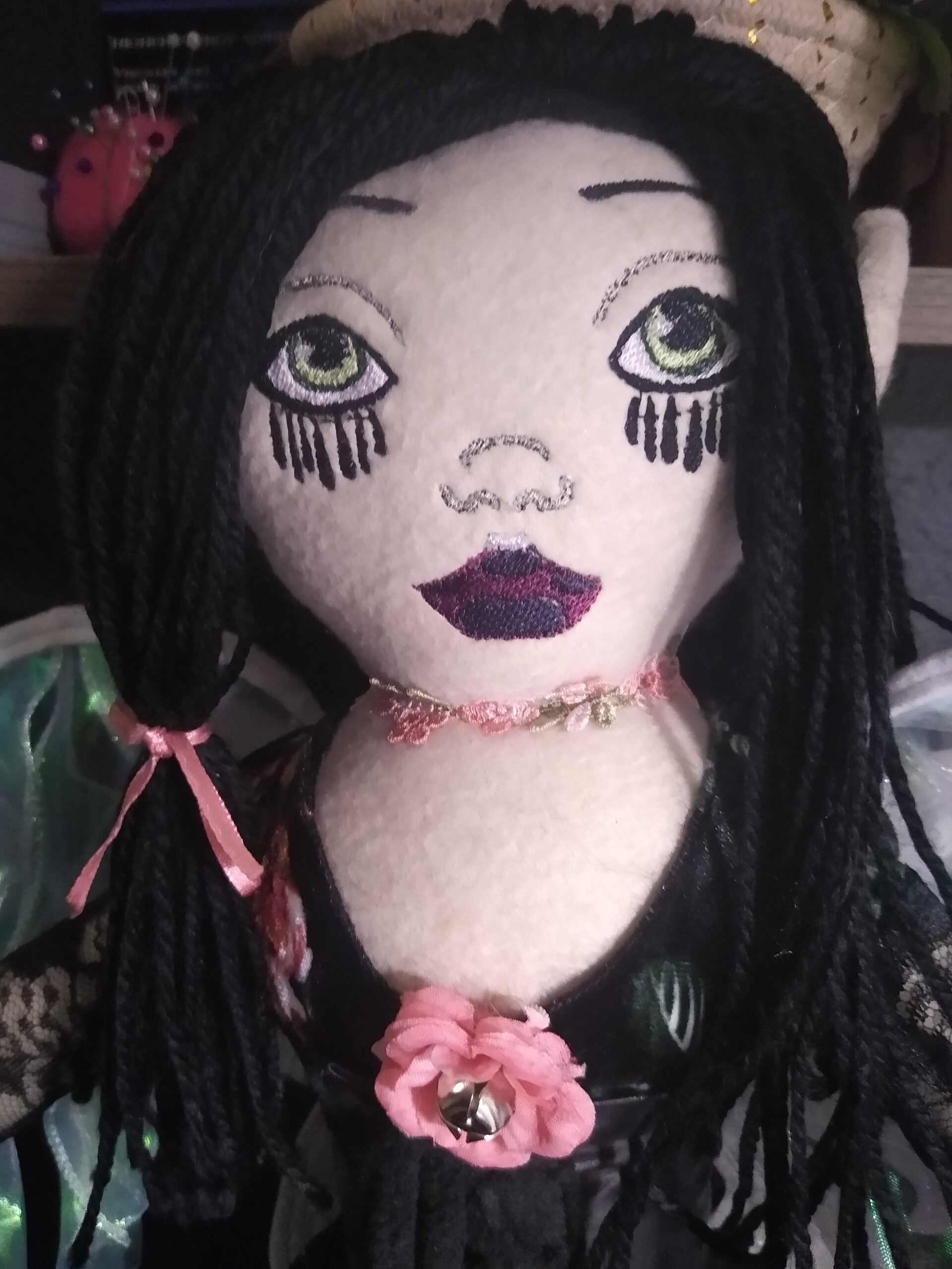 This Gothic Faerie doll has wired wings with flowing materials, (Unlike the tulle winged dolls,) as well as embroidered digitized butterfly wing design. My dolls are handmade one of a kind faerie, fae, fairy plush soft dolls, made with various remnant fabrics. There will be no one “a-like” this original doll. They are large, approximately 20 to 22 inches, with an embroidered butterfly that landed on their hand. The body is created with fleece fabric, faces embroidered with my original digitized design. Hair is sewn on with a wig of yarn with a felt scalp on most. Clothes are typically sewn onto the doll. The wings are embroidered with my own design onto holographic material, tulle, yarn or ribbon and silk flowers, and come off by way of velcro. My dolls are machine and hand sewn. If any of my dolls have beads, sequins, buttons, or small parts of any kind, just a warning they can possibly be harmful to young children. Damp cloth wash ONLY. Please look closely at pictures or message me with questions.